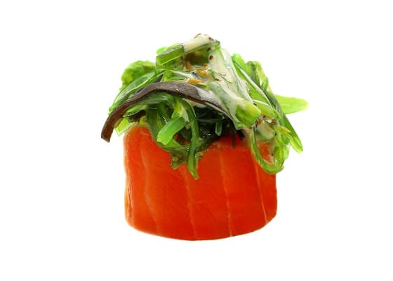 Лосось, сливочный сыр, салат чука, ореховый соус, рис, нори