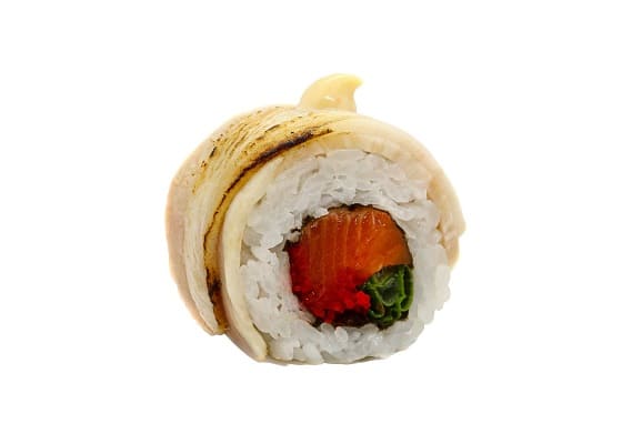 Бекон опаленный, лосось, зелёный лук, икра летучей рыбы, соус Айсберг, рис, нори