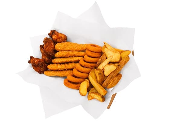 Картофель фри – 100 гр., наггетсы – 5 шт., луковые кольца – 7 шт. + соус на выбор: кетчуп, сырный, чесночный, барбекю, горчичный, кисло-сладкий