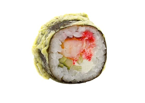 Икра масаго, креветка, сыр, огурец, темпурный кляр, рис, нори.