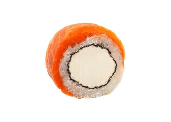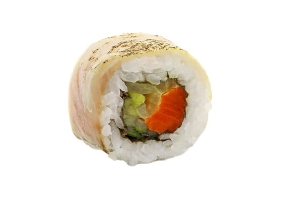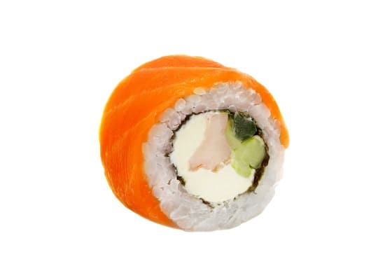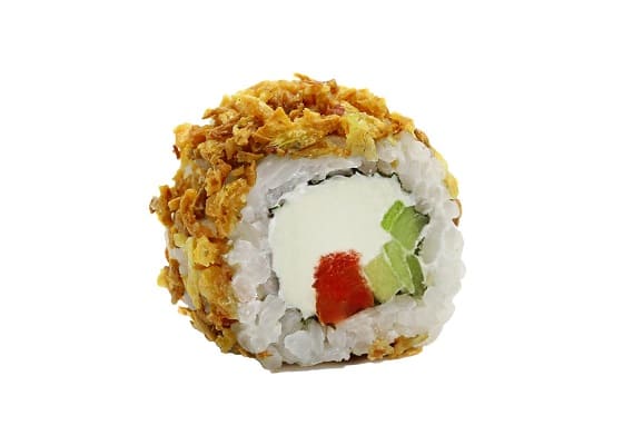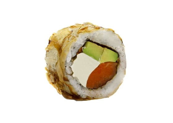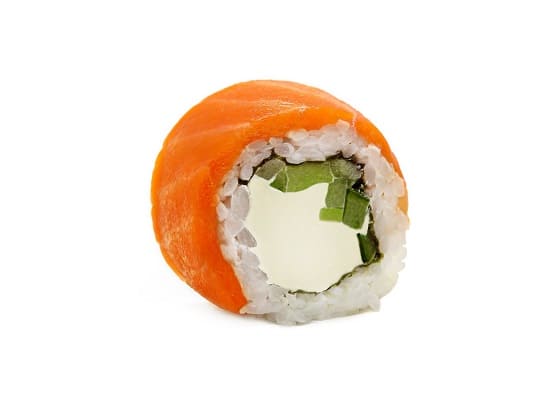 Копченый лосось, огурец, сливочный сыр, жареный лук, рис, нори.