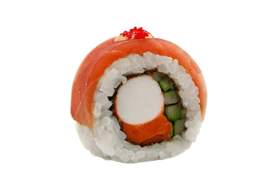 Копчёный лосось, сливочный сыр, авокадо, стружка тунца, рис, нори