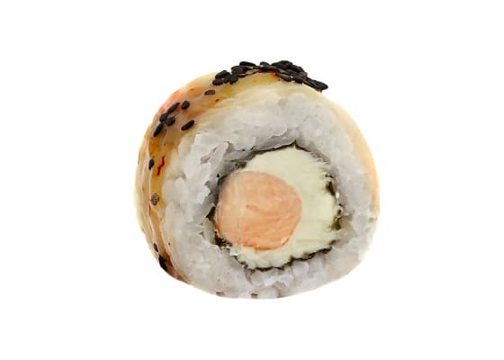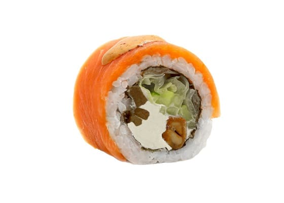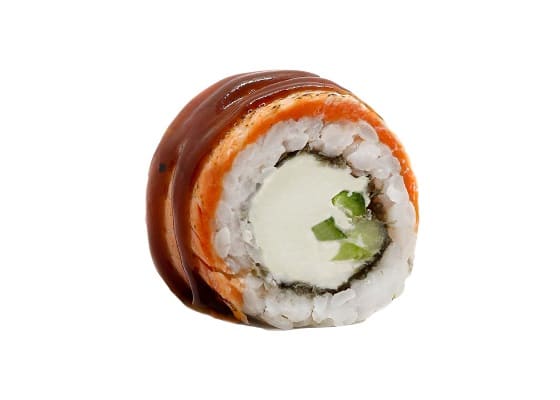 Лосось опаленный, сливочный сыр, огурец, рис, нори, соус барбекю.