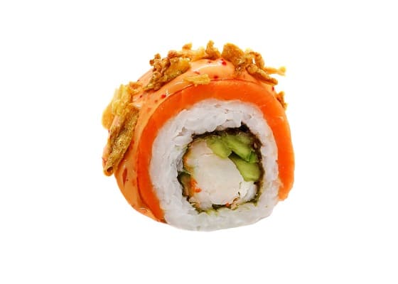 Креветка, копченый лосось, огурец, спайси чесночный, лук жаренный, рис, нори.