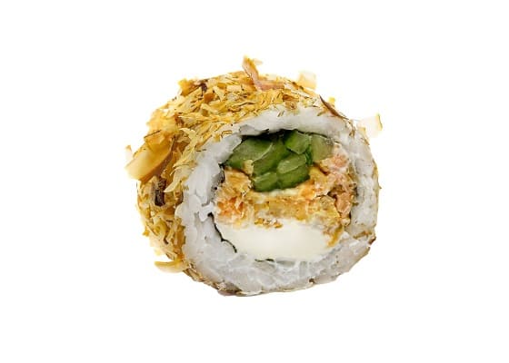 Лосось жареный, сливочный сыр, огурец, стружка тунца, рис, нори
