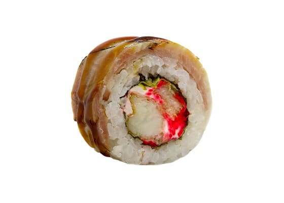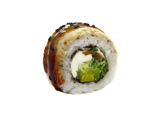 Угорь, сливочный сыр, салат чука, такуан, кешью, соус Терияки, кунжут микс, рис, нори