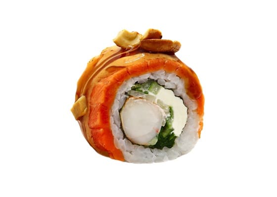Лосось копчёный, сливочный сыр, перец печёный, огурец, кешью, пекинская капуста, соус Спайси, рис, нори
