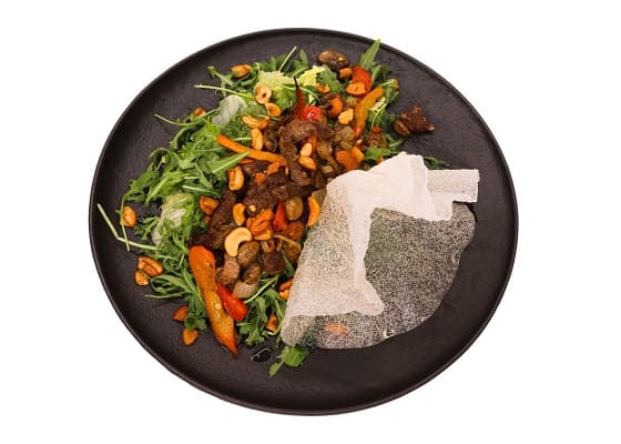 говядина, рукола, салат айсберг, перец болгарский, грибы шампиньоны, чеснок, лук репчатый, кешью, рисовая бумага, оливковое масло, сок лимона.