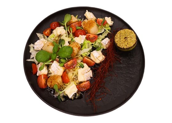 Салат айсберг, гребешок, черри, камамбер, перец черный, чеснок, соус бальзамический, кимчи, масло оливковое.