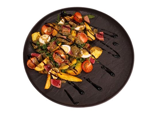 картофельные дольки, рукола, черри, тунец, яйцо отварное, горчица французская, масло оливковое, перец черный, сок лайма, бальзамический уксус.