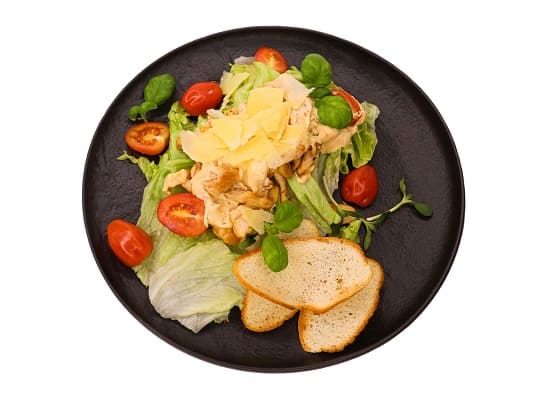 салат айсберг, курица, чеснок, черри, сыр твердый, гренки, майонез, французская горчица, соевый соус, сок лайма.