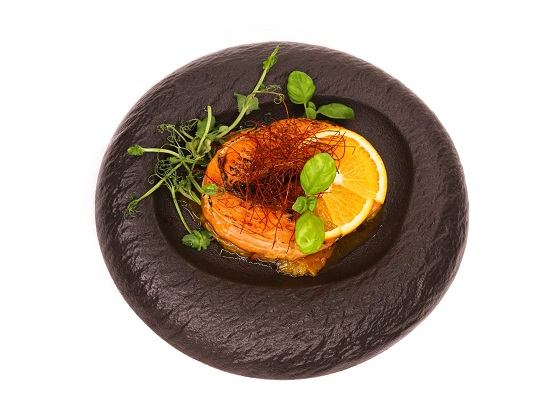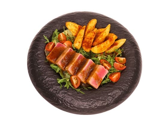 Тунец, терияки, понзу, картофель по-деревески, салат айсберг, руккола, черри.