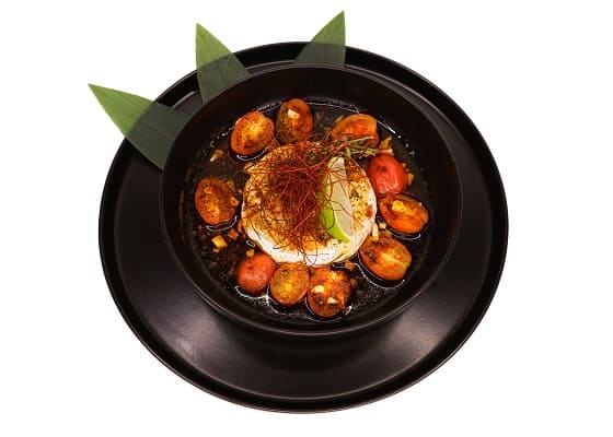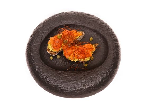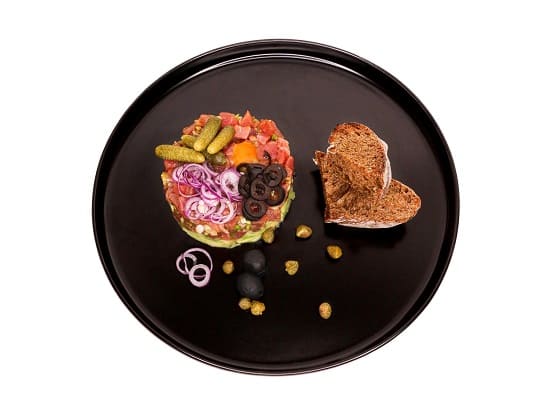 Каперсы, тунец, кунжутное масло, соевый соус, зеленый лук, сок лайма, авокадо, соль, лук севок, карнишоны, желток перепелки, розмарин, маслины, чиабатта, лайм.