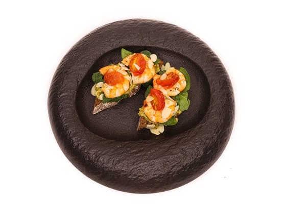 Креветка, гуакомоле, чеснок, черри, стружка миндаля, чиабатта.
