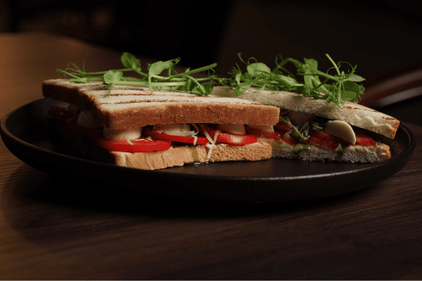 хлеб тостовый, крем-чиз со сливками, томат свежий, моцарелла молодая, соус песто, пармезан.