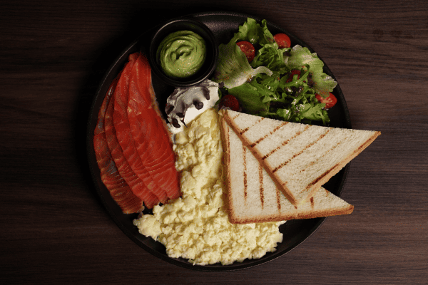форель с/с, гуакамоле, крем-чиз со сливками, микс салатов, черри, скрембл, тосты поджареные, заправка салатная.