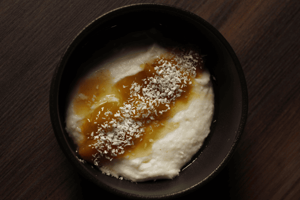 крупа манная, молоко кокосовое, молоко, масло сливочное, джем из манго, стружка кокосовая.