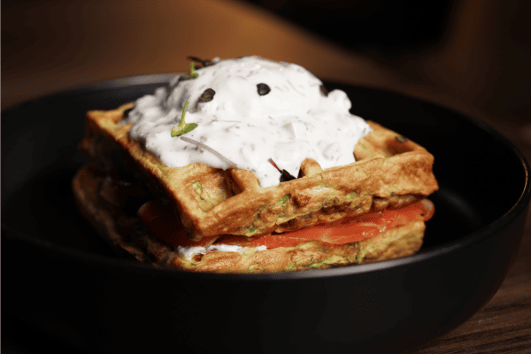 вафли из цукини, крем-чиз со сливками, форель с/с, яйцо-пашот, соус на йогурте и лимоне.