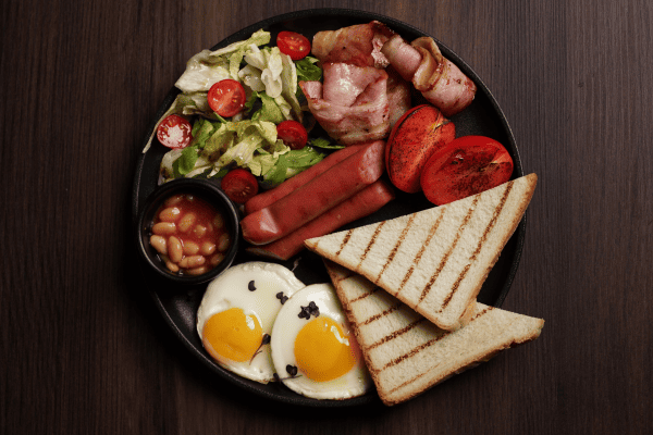 яйцо, охотничьи колбаски, грудинка, томат жареный, микс салата, черри,тосты.