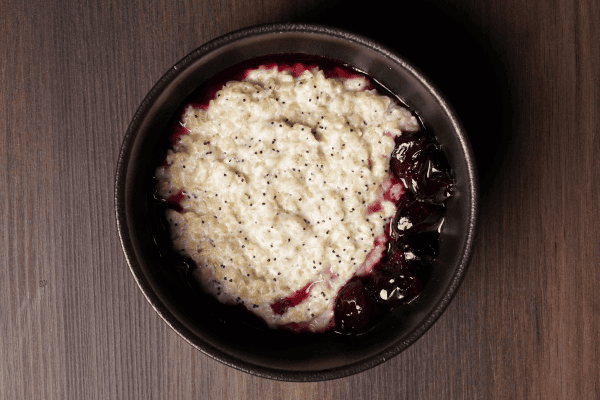 хлопья овсяные, молоко, мак, масло сливочное, компоте с черешней.
