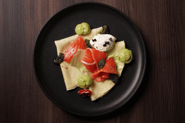 Блинчики, форель с/с, гуакамоле, крем-чиз со сливками, соус песто.